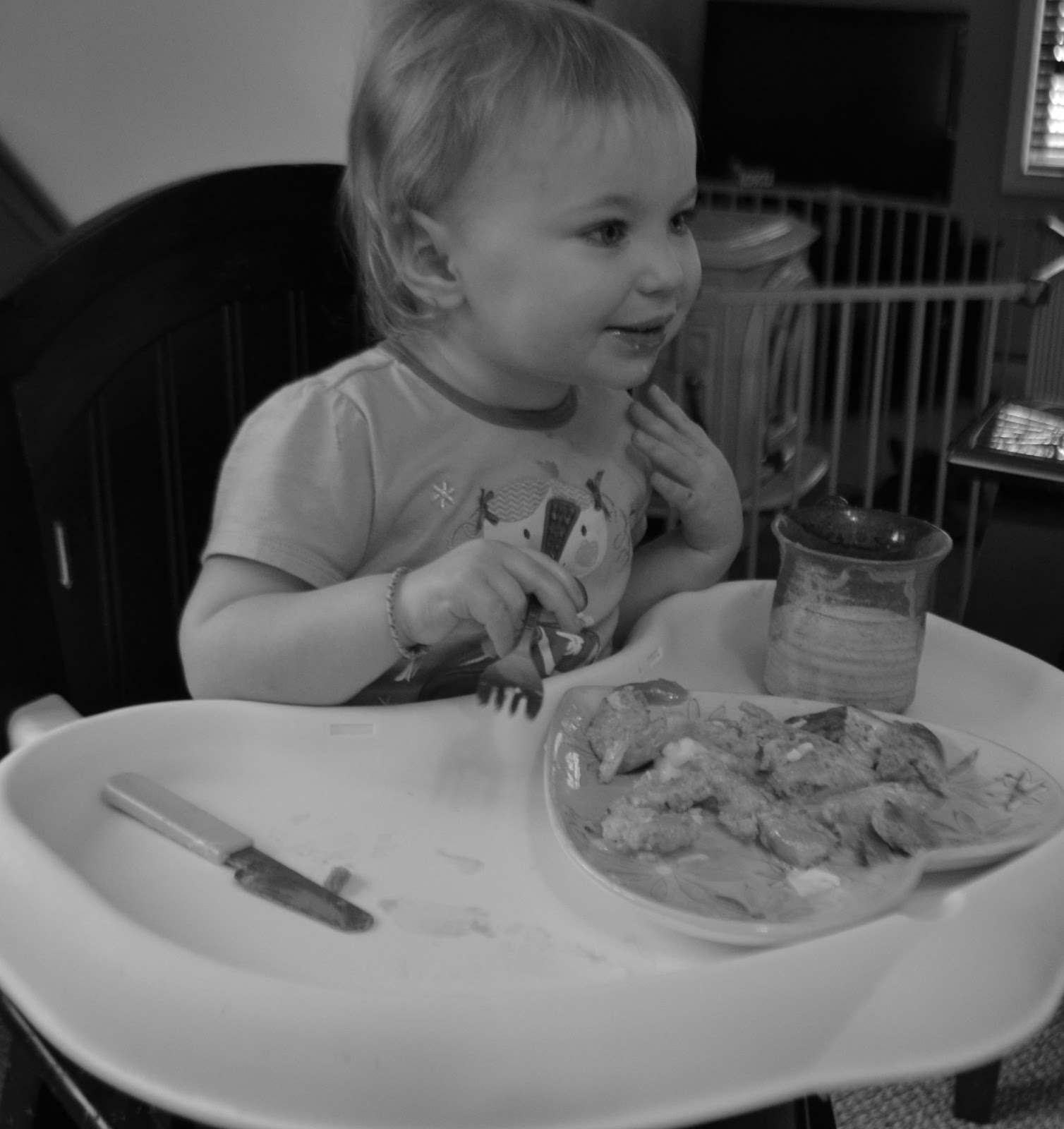 She is getting good using her knife. She ate on her bunny plate.